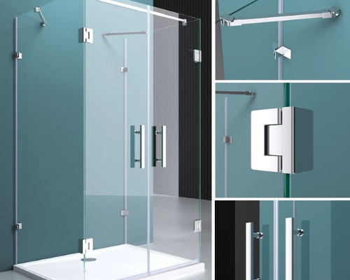 Phòng tắm kính: bản lề, kẹp góc, kẹp cố định, chặn nước và gioăng từ.