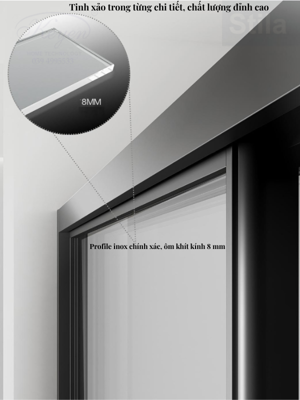 Profile inox độ chính xác cao, ôm khít gần như liền mạch với kính 8mm, từng chi tiết đều toát lên vẻ tinh xảo và chất lượng vượt trội.